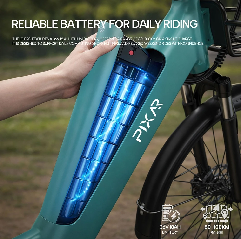 A PIXAR C1 PRO egy nagy kapacitású 36V 18Ah akkumulátorral érkezik. Ez akár 80-100 km hatótávot biztosít egyetlen töltéssel. Ideális a napi ingázáshoz és a hosszabb hétvégi túrákhoz is.